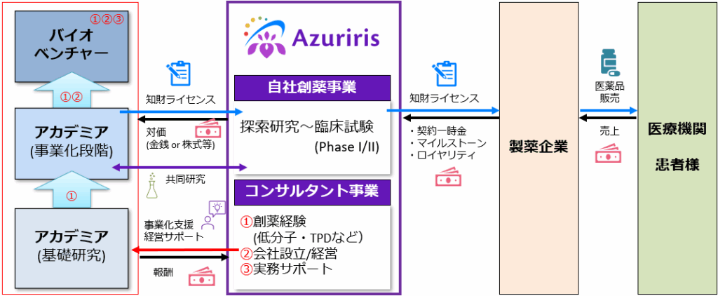 製薬企業での研究経験、ベンチャー企業の経営およびExit経験、さらにはベンチャーキャピタルでの勤務経験など、経営陣の高度な専門性と実績を活かし、アカデミアに眠る有望なシーズを発掘しています。発掘したシーズは自社で研究開発を進め、探索研究から臨床開発初期段階(Phase I/II)までの創薬研究を実施した上で、製薬企業へのライセンスアウトを推進しています。
