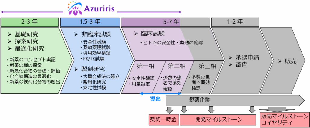 当社は、探索から初期臨床段階までの研究を実施し、一定の成果を得た段階で製薬企業へ導出(ライセンスアウト)します。